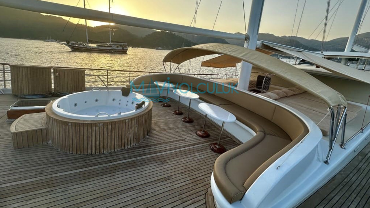 Tam donanımlı ayrı bir mutfak, açık ve kapalı yemek bölümü ile klimalı bir salonu bulanan kiralık delüks teknemizin arka güvertesinde son derece konforlu bir oturma alanı, büyük bir yemek masası ve dümen bulunmaktadır. Teknemizin ön güvertesinde oturma alanı, güneşlenme minderleri, masa ve misafirlerimize keyifli bir atmosfer sunmak için yapılmış bir jakuzi bulunmaktadır.