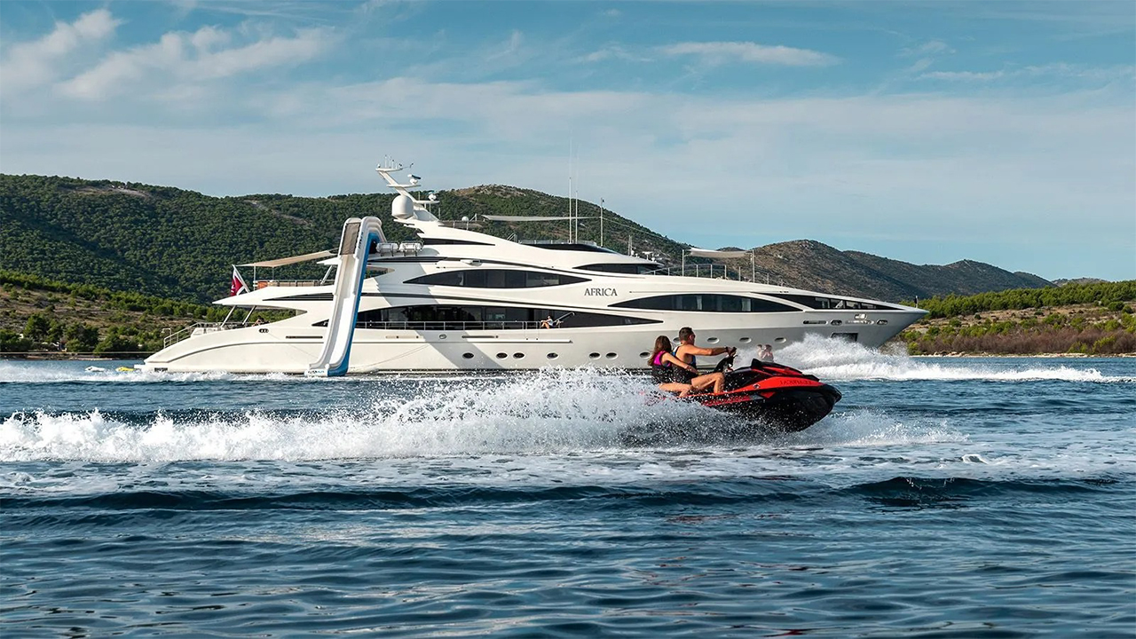 When not cruising Africa I has onboard an incredible selection of water toys and accessories for you and your guests to connect with the waters around you. Principle among these are waterslides bringing a sense of fun that all the family can enjoy. Additionally, there are waterskis that are hugely entertaining whether you are a beginner or a seasoned pro. Also there are two Cayago F5S SEABOBs, that allow you to skim along the surface or steer under the crystal water and experience life swimming with the fish. If that isn't enough Africa I also features wakeboards, wakesurf boards, inflatable water toys, paddleboards and snorkelling equipment. When it comes to Tenders, Africa I has you covered - with two tenders, including a 10m/32'10" Onda Chase Tender.
