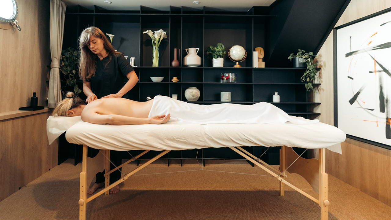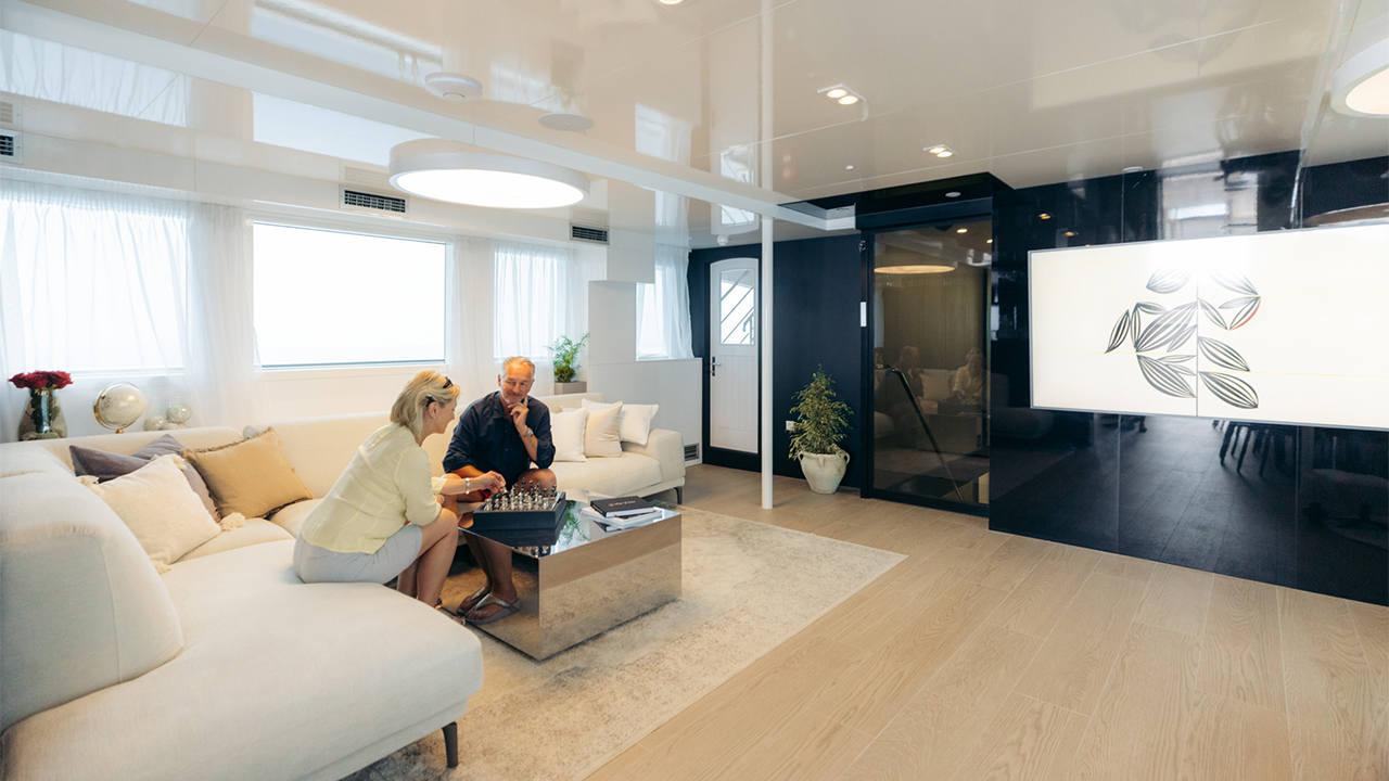 The lower deck hosts the crew cabins forward followed by the media room, where there is a long sofa for large groups to converse and watch TV together. Amidships is the guest accommodation, followed by the sauna to port, the massage room to starboard and a large gym behind. More crew cabins are aft and the engine room is in the stern.