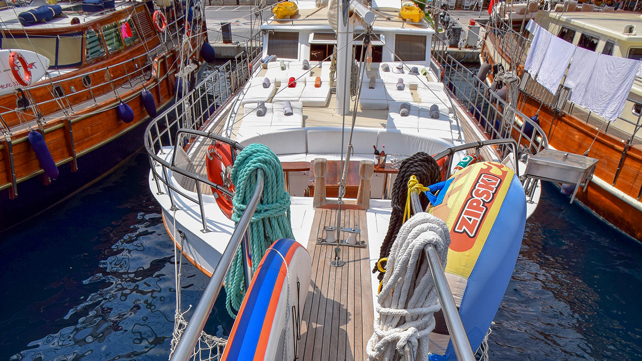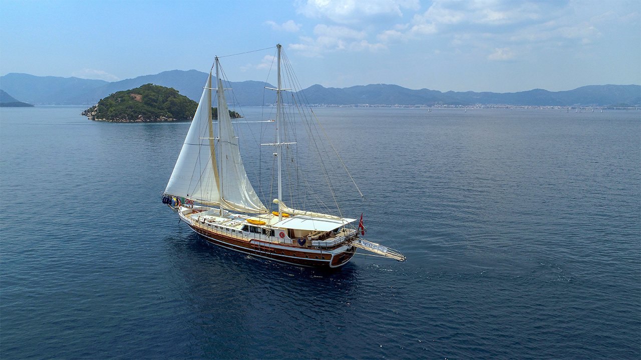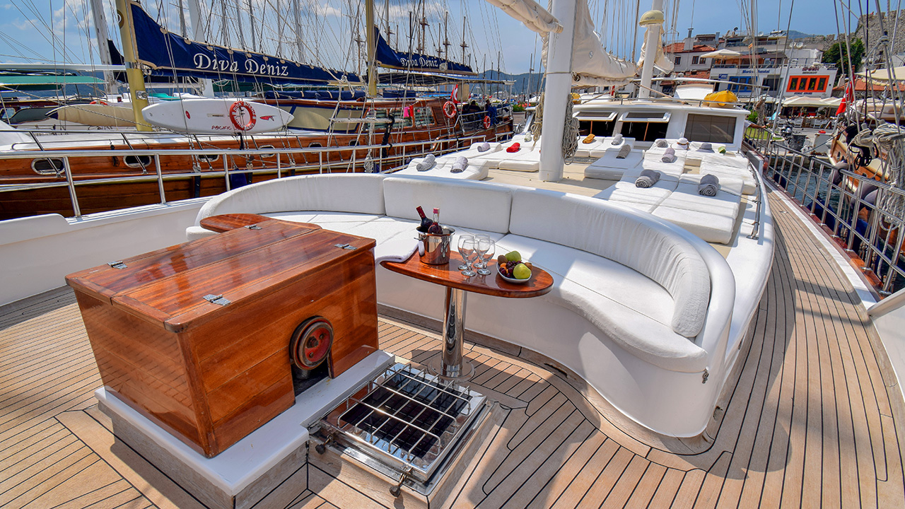 The Perla Del Mar gulet is luxury charter based in Marmaris Turkey. She accommodates up to 16 guests in 6 double cabins and 2 twin cabins. Each cabin is equipped with air conditioning and en suites. Superb comfort, good service, spacious all throughout. The aft is furnished with a large mahogany table and chairs for alfresco dining and social gatherings; as well as over-sized lounging cushions. The Perla Del Mar gulet is served by a crew of 4; namely Captain, cook, and two deckhands. Guests will enjoy a selection of waters which also include water skis. An ideal, yet affordable gulet charter for large groups.
