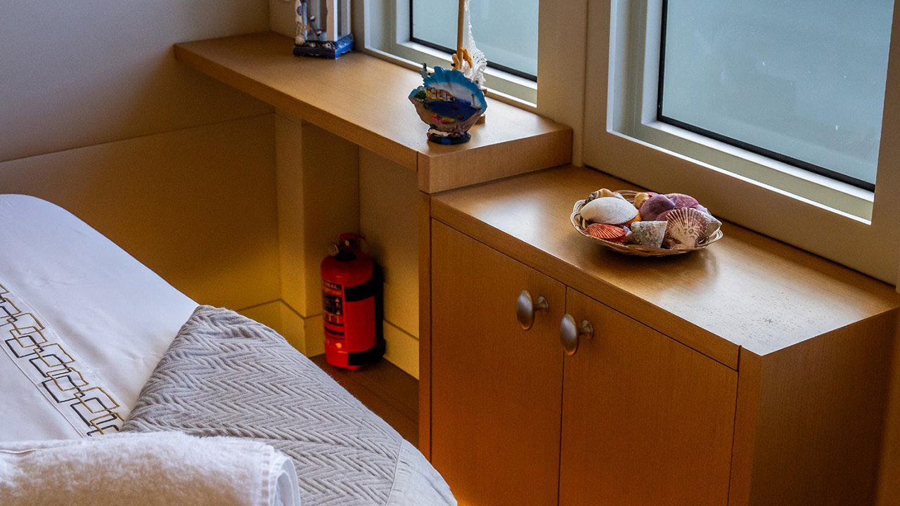 A great safety factor in the Maison Marine Yachts is filling empty compartments with closed-cell foam allowing more than 50 tons of buoyency well distributed throughout the whole yacht …for a boat that distributes less than 20 tons empty weight.